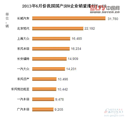 2013年6月國(guó)產(chǎn)SUV企業(yè)銷(xiāo)量排行Top10