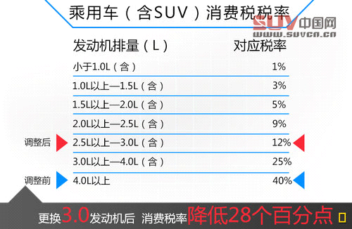 新引擎的應(yīng)用除給新款卡宴帶來動(dòng)力的提升外,更低的排量也將為新款車型帶來更低的售價(jià)?,F(xiàn)款卡宴S所搭載的4.8L發(fā)動(dòng)機(jī)要繳納40%的消費(fèi)稅,而全新車型所搭在的3.0L增壓引擎的稅率僅為12%,降低了28個(gè)百分點(diǎn)。