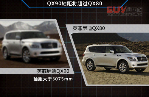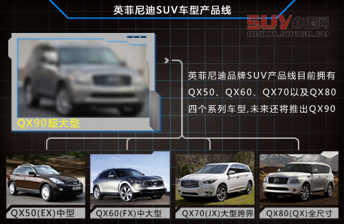 英菲尼迪在售的四款SUV根據名字中的數字大小分別對應中型、中大型、大型跨界和全尺寸四個級別,而計劃推出的超大型SUV車型QX90將超越全尺寸QX80所擁有的3075mm軸距,成為英菲尼迪品牌SUV產品序列中新的旗艦級車型。