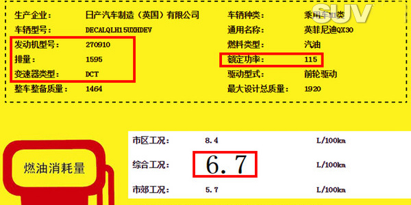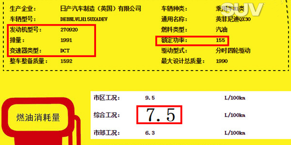 動力方面,預計在國內上市的英菲尼迪QX30將采用1.6T和2.0T兩款汽油發動機,海外版本的柴油發動機將不會引入國內銷售。發動機采用的是奔馳GLA上的兩款發動機,其中1.6T發動機最大功率115KW,最大扭矩250N·m,2.0T發動機最大功率155KW,最大扭矩350N·m。傳動方面,與發動機匹配的是7速雙離合變速箱。另外,從國家工信部發布的信息可以看出,搭載1.6T渦輪增壓發動機的車型,匹配一臺7速DCT雙離合變速器,采用前輪驅動,百公里的綜合油耗為6.7L。而2.0T車型搭載的同為7速DCT雙離合變速器,采用前輪驅動,百公里油耗為7.1L。
