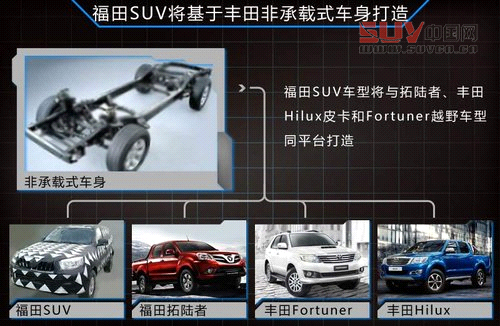 目前福田旗下拓陸者與豐田越野車型Fortuner以及皮卡車型Hilux同平臺打造,均采用非承載式車身底盤,而未來福田全新SUV車型也有望基于該平臺生產。豐田研發的此款平臺具有生產皮卡與中大型SUV的能力,福田全新SUV與拓陸者同平臺打造,不僅能夠降低生產成本,同時縮短了新車研發時間。