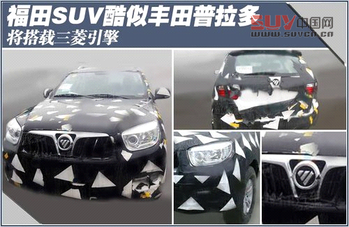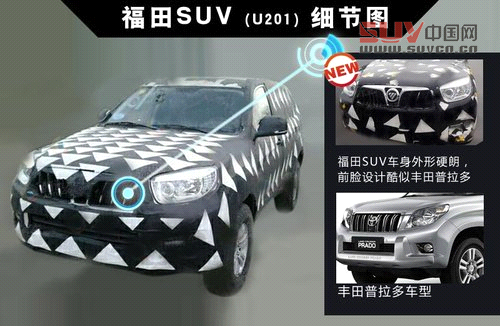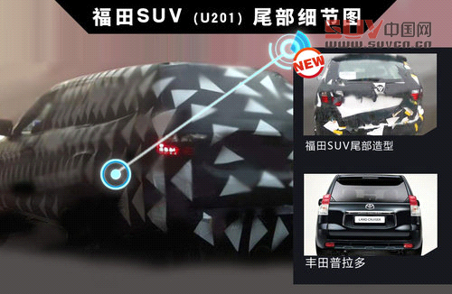 福田SUV車型外觀硬朗,前臉設計酷似豐田普拉多,中網及前大燈造型簡潔,整體線條分明,外觀具有運動感。尾部除車尾大燈與牌照等位置與普拉多有所差異,整體造型與普拉多基本一致。此外新車將采用非承載式車身結構,并配備大尺寸的245/70 R16厚胎壁寬幅輪胎,以突顯其硬派越野的定位。