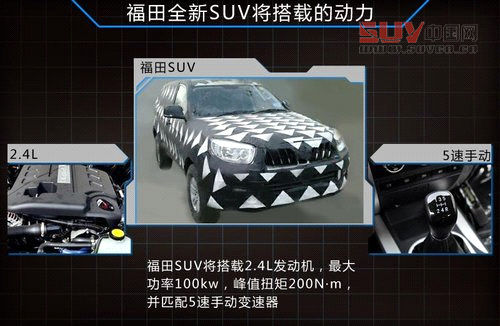 福田全新SUV車型將搭載航天三菱制造的2.4L汽油發動機,其最大功率為100kw,峰值扭矩200N·m,并匹配5速手動變速器。目前福田旗下皮卡車型拓陸者也搭載的三菱2.4L引擎,預計未來該款發動機還將匹配到旗下更多SUV車型中。另外,福田全新SUV還有望推出兩驅版和四驅版供消費者選擇。
