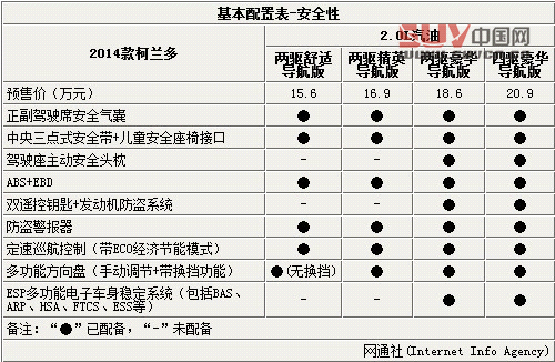 在舒適性配置方面,2014款柯蘭多全系均標配了6揚聲器、室外溫度顯示器、柱式車頂天線以及GPS導航和倒車影像。除此之外,豪華版車型配備了全自動空調,而低配版車型則配備的是手動空調,