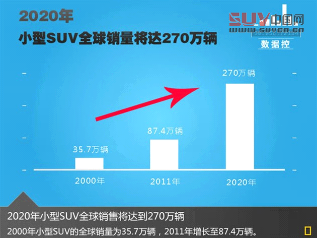根據此前媒體公開報道,2000年小型SUV車型的全球銷量為35.7萬輛,2011年其銷量增長至87.4萬輛。預計到2020年,小型SUV的全球總銷量將達到270萬輛。路虎此次推出入門級小型SUV,將有助其拓展SUV市場的同時,提高其品牌的市場競爭力。