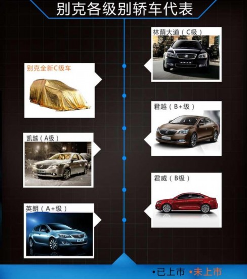 在上海通用汽車公司旗下,別克推出的車型基本覆蓋了各個級別。不算SUV和MPV陣營,單在轎車旗下就擁有三款A級車型,分別是:英朗XT、英朗GT和凱越;明星車型君威及其性能版車型君威GS則代表了B級系列;君越則是在君威的基礎上繼續進行全方位升級,走的是B級車C極化;而林蔭大道是目前別克最高級別的一款車型。