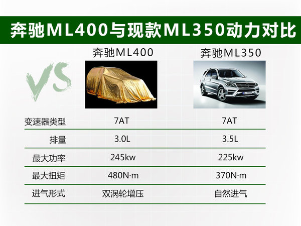 SUV中國網報道 奔馳在2013年9月推出旗艦車型全新S級,新車搭載了型號為M276的3.0T雙渦輪增壓引擎。而對于奔馳現在唯一一款搭載3.5L自然進氣引擎的奔馳ML而言,搭載更小排量的增壓引擎已經成為一個趨勢。近日編輯從國家環境保護部了解到:奔馳ML將推出一款搭載3.0T雙渦輪增壓發動機的車型,新車將命名為“ML400”。與目前的引擎序列相比,更小的排量有助于減小尾氣排放,且根據中國市場的消費稅率3.0T引擎將小幅降低這款車型的稅額。