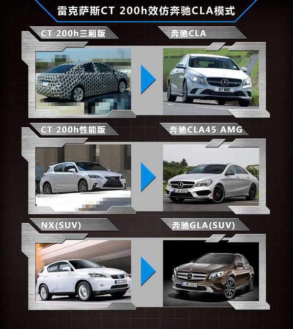 CT200h是雷克薩斯首款全系配備混合動力系統的A級豪華轎車車,同時也是雷克薩斯“混合動力元年”的代表車型。此前,奔馳基于MFA前驅模塊化平臺打造了CLA(三廂),且將于明年國產,而該平臺衍生出的奔馳CLA45 AMG(性能版)和奔馳GLA(SUV)也有望在未來兩年引入國內。對此,雷克薩斯也將基于CT 200h平臺,衍生出3款車型,包括CT 200h三廂版,CT 200h性能版和SUV車型-CX 200h。