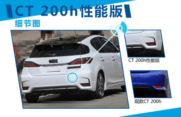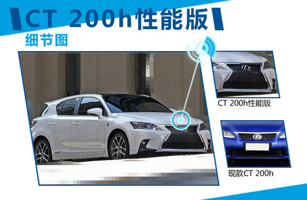 從外觀來看,雷克薩斯CT 200h性能版與現款最大的區別來自于前臉部分,新車前臉更換成了雷克薩斯家族紡錘式前臉,采用黑色蜂窩狀裝飾,前霧燈外部則改為C形,尾部保險杠也有小幅調整。