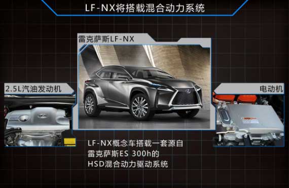 動力方面LF-NX概念車搭載一套源自雷克薩斯ES 300h的HSD混合動力驅(qū)動系統(tǒng),這套系統(tǒng)由最大功率為118kW的2.5L汽油發(fā)動機與最大功率為105kW的電動機組成,綜合功率達到151kW。Nobuyuki Tomatsu表示:概念車的這套動力只是入門選擇,量產(chǎn)車將有望提供四驅(qū)系統(tǒng)。