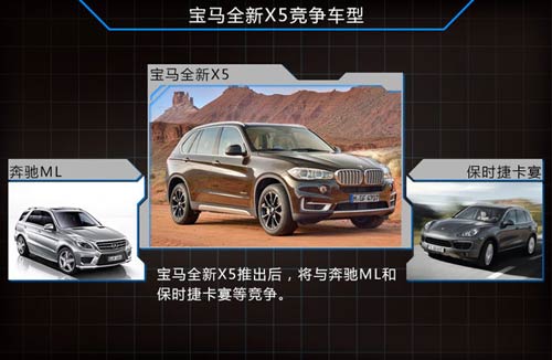寶馬全新X5推出后,在這一市場中將與老對手奔馳ML和保時捷卡宴等競爭,全新的外觀設計以及小排量發動機的搭載,將與競爭對手展開全面抗衡。此外,新車的2968mm的軸距在同級別車型中優勢較為明顯,而2.0T柴油引擎的使用以及內部空間的提升,在與競爭對手抗衡的同時性價比將更加出眾。