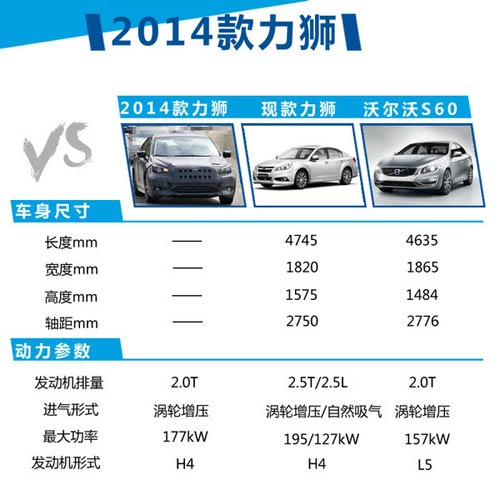 2014款力獅動力方面搭載的是全新2.0T渦輪增壓引擎,替代了現款的2.5T發動機,該引擎采用的是主流的缸內直噴技術,最大功率為177kW,最大扭矩為400Nm,而同屬該級別的沃爾沃S60也采用了2.0T引擎,最大功率為157kW,單從數據上來看,而這動力相差不大,因此新款力獅將競爭對手直接鎖定在了沃爾沃S60。