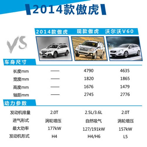2014款傲虎與力獅一樣搭載的是全新2.0T渦輪增壓引擎,該款增壓發動機采用雙渦管技術,壓縮比達到10.6:1,最大功率為177kW,最大扭矩為400Nm,新車將直接與沃爾沃V60展開正面較量,V60搭載的是2.0T渦輪增壓引擎,最大功率為157kW。