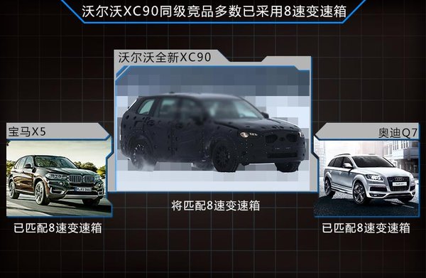 隨著燃效標準的實施以及用戶對于車輛平順性要求的提升,高檔位數(shù)變速箱,成為了行業(yè)中的發(fā)展趨勢。其中寶馬X5以及奧迪Q7等同級別豪華SUV均已開始匹配8速變速器,而仍采用5速自動變速箱的現(xiàn)款XC90在市場競爭中則略顯不足。隨著全新動力總成的研發(fā)成功,也將彌補在此項對比中的不足,增加與對手競爭時的籌碼。