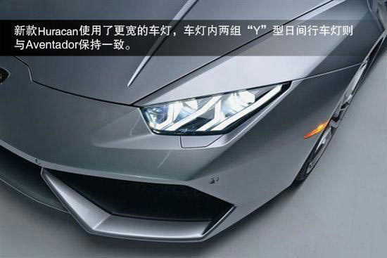 蘭博基尼Huracan相比已經停產的蓋拉多有了不小的改進,全新設計的前大燈看上去更加兇狠。蓋拉多上那款長條形的車燈已經被廢棄,新款Huracan使用了更寬的車燈,車燈內兩組“Y”型日間行車燈則與Aventador保持一致。