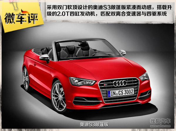 繼奧迪S3 Sportback、S3 Limosine之后,奧迪為全新一代S3加入了最后一款車型S3 Cabriolet敞篷車。該車型將在3月開幕的第84屆日內瓦國際車展上正式亮相,預計售價為4.85萬歐元(約合人民幣39.7萬元)。至此,8V系列全部S3車型至此已經全部發布。
