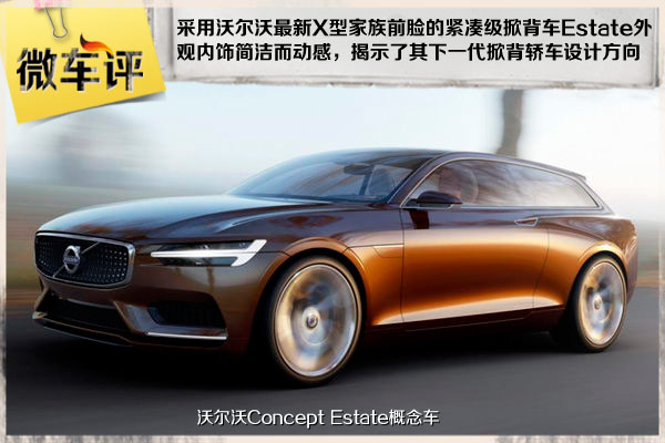 沃爾沃Concept Estate概念車采用了與Concept XC Coupe概念車相似的設計風格,前臉以尺寸較大的、方形進氣格柵為主,格柵中央為碩大的沃爾沃標志以及象征安全帶的標志輻條。