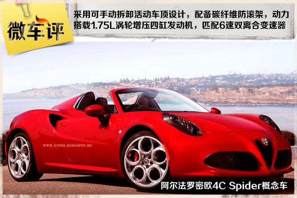 近日從海外媒體處獲悉,在3月開幕的日內瓦車展上,阿爾法羅密歐4C Spider概念車將正式亮相,新車將采用活動車頂設計,動力上搭載1.75L的渦輪增壓四缸發動機。