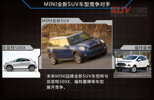 未來MINI CLUBMAN在車身長度提升后,有望成為MINI旗下全新的SUV車型,未來該車型在上市后,將與菲亞特500X以及福特翼博等車型展開競爭。而后兩者在品牌知名度方面均不及MINI品牌,而在該領(lǐng)域中Jeep也將投產(chǎn)小型SUV,其也將成為MINI全新SUV的競爭對手。