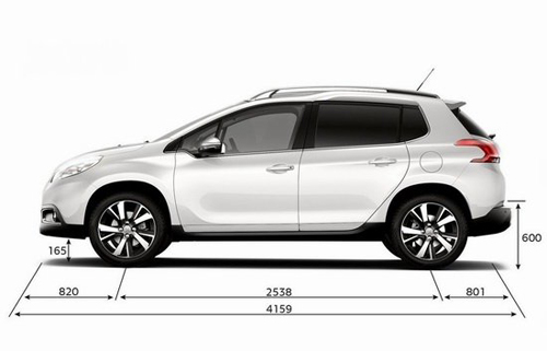 標致2008軸距2538mm,剛好介于翼博和昂科拉之間。而車身尺寸方面,標致2008長寬高分別是4159/1739/1556mm,在長度和高度比兩個競爭對手要低一點。不過離地間隙仍然達到了165mm,比一般轎車高出了不少。