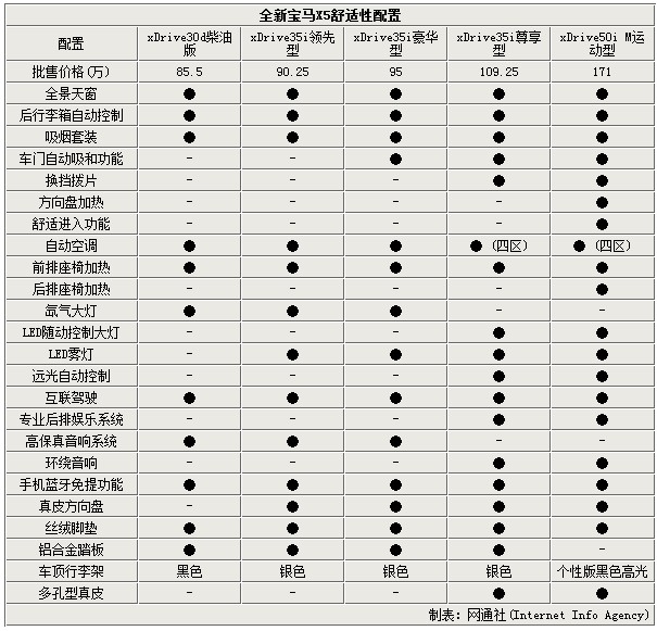 在去年的廣州車展期間,寶馬全新一代X5正式亮相。新車除常規汽油版本車型外,還首次引入一款柴油版本。近日網通社獲取了全新X5的詳細配置信息,柴油版將成為全新X5的新入門版本,并且全系車型在配置方面均有所提升。此外我們從寶馬中國官方了解到,全新X5將于2月19日正式上市。