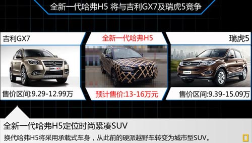 由于全新一代哈弗H5的車型定位有所改變,待這該車上市后,將不再與硬派越野車競爭,轉而形成與奇瑞瑞虎5、吉利GX7等車型對標,以搶占國內熱銷的城市SUV細分市場。同時在哈弗品牌緊湊SUV的產(chǎn)品進行重新布局,進一步提升品牌的影響力。