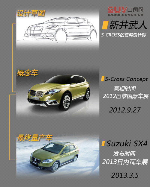 鈴木之前所亮相的S-CROSS概念車仍然由日本本土設計師新井武人完成,從概念車上便可以看出新車的外觀上將要比現款時尚很多。而最終的量產發布也與概念車相隔半年時間,可見鈴木對于新車渴望程度。