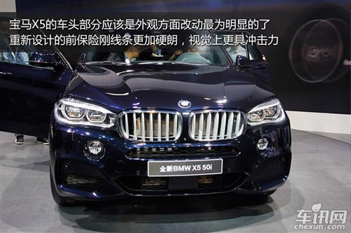 新一代寶馬X5采用了新家族式前臉,雙天使眼大燈與發(fā)動(dòng)機(jī)蓋上四條硬朗的線條,雙腎式進(jìn)氣格柵,與新3系如出一轍。新的霧燈位置看起來很獨(dú)特,而前保險(xiǎn)杠底腳處造型類似字母b的裝飾也是X5的最新風(fēng)格,新款大燈同樣是采用了切圓的天使眼以及LED燈組。