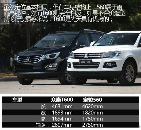 從兩車的車身參數上可以看出,眾泰T600的風格更偏向于成熟SUV的設計思路,偏向舒適性及可靠的操控性,而寶駿560所采用的平臺源自商務車,較高的車身結構更接近于面包車,所換來的高速穩定性就不太理想了。