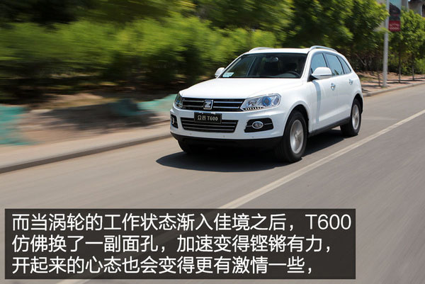 不過當轉速超過2000rpm之后,渦輪開始進入工作狀態,這時T600的潛力好像也被瞬間喚醒一般,一改之前懈怠之態,油門與發動機之間的匹配度順暢、積極了許多,動力輸出也有著非常顯著的提升,急加速時動力的傳遞更能跟得上駕駛者的節奏,也更有激情,這種更為強烈、有勁兒的提速催促感絕對可以滿足絕大部分人的超車需求。不過一般小排量渦輪發動機在后段會有動力下滑,但是讓我沒有想到的是T600上這臺1.5T發動機在高轉速時還能有讓人滿意的動力迸發,即便轉速高達5000rpm時,就算收油然后再踩油門,還可以感覺到車身會有小幅的前竄。