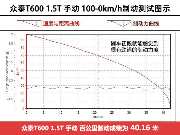 由于是手動擋,所以在測試百公里加速時需要反復找到最佳以及最快的油離結合點,以保證能測出最快的加速成績。T600的起步轉速要控制在2000-2500rpm之間,跌落這個區間動力會不足,超過這個區間動力又會過剩導致驅動輪長時間打滑。測試時,離合器不能太快抬起,要含著點兒加速,并且短促、利落的換擋行程也都有利于縮短加速時間。