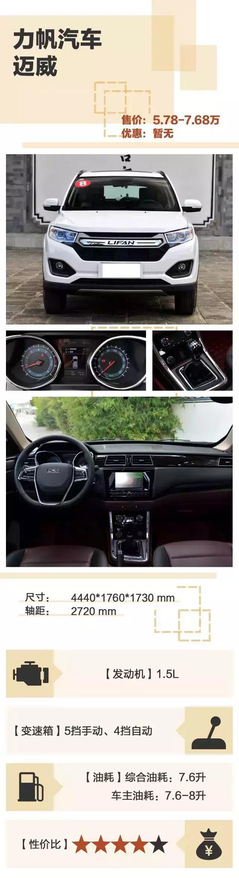 點(diǎn)評(píng): 力帆旗下的產(chǎn)品從小型車(chē)到緊湊型車(chē),從微面產(chǎn)品再到SUV車(chē)型,其種類(lèi)并不算少。不過(guò)其產(chǎn)品設(shè)計(jì)總是相貌平平,直到全新邁威的出現(xiàn)給了大家全新的感受,時(shí)尚硬朗的外觀,配置也是豐富,帶有無(wú)鑰匙啟動(dòng)以及電動(dòng)天窗,這些看得見(jiàn)的配置突顯了更高的性價(jià)比,畢竟價(jià)格擺在那。