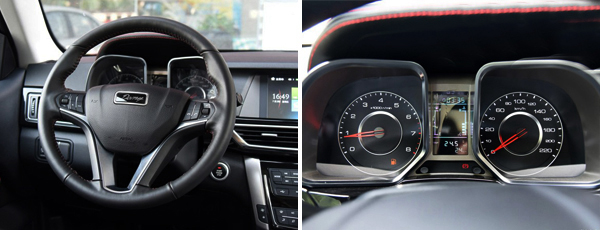 內飾整體設計感強,紅色縫線充滿了年輕動感的氣息,用料雖然不算高檔但是好在做工還不錯。三輻式方向盤帶有打孔皮質包裹和銀色裝飾條,與整體的內飾氛圍比較搭;炮筒式儀表設計感強,只是水溫表和油量表指針設計太過顯眼,儀表板中間的液晶屏負責顯示行車電腦和多媒體信息。
