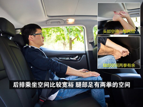 雖然是緊湊型SUV,逍客在車身尺寸方面并沒有占多大的優勢,2646mm的軸距也不算搶眼。但是日產就是善于開發空間和舒適度,逍客的后排空間表現是值得肯定的。受到外形的影響,后排頭部空間不算充裕,但是腿部空間表現出色,滿足家用沒有問題。看來后獨立懸掛并沒有在空間方面給逍客帶來太大麻煩。