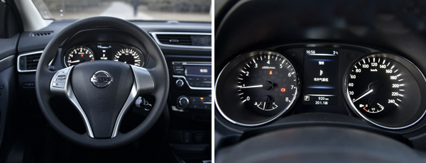 內(nèi)飾方面,逍客的內(nèi)飾風(fēng)格采用了名為飛翼式的環(huán)抱一體化布局,整體風(fēng)格與外觀相呼應(yīng),偏向年輕運動,很好的迎合了年輕人的審美。方向盤,采用了三輻式設(shè)計,方向盤多功能按鍵采用的是鍍鉻裝飾條,這樣給人感覺一種高端的運動感。儀表盤方面同樣采用的是是雙圓形類似炮筒式設(shè)計理念,不過中間的小屏幕顯示的信息非常豐富,行車電腦里還有對車道偏離提醒、盲區(qū)檢測、緊急制動以及駐車輔助等功能。