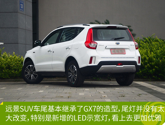作為GX7的換代車型,外觀方面,遠景SUV相比于現款GX7,遠景SUV的變化堪稱脫胎換骨,就好像一個體脂40%胖子通過嚴格的訓練之后變成了一個體脂15%的擁有六塊腹肌的型男。前進氣格柵使用了水滴漣漪家族式造型,并融入了“回紋”設計,車側的展翼式腰線勾勒出肌肉感,車尾燈使用了光導LED,看上去更加優雅。