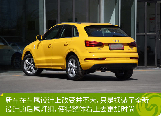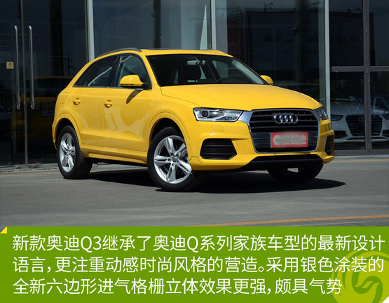 奧迪新款Q3繼承了奧迪家族Q系列車型的最新設計語言,更注重動感時尚風格的營造。采用銀色涂裝的全新六邊形一體式進氣格柵三維效果更強,頗具氣勢。水平方向外張式前臉造型使車體看上去更寬,也更加沉穩,進一步強化了SUV特征。新車還換裝了全新設計的后尾燈組,使得整體看上去更加時尚。