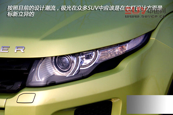 按照目前的設計潮流,極光在眾多SUV中應該是在車燈設計方面最標新立異的。在設計上不但融合了路虎攬勝經典的圓形頭燈設計,也使用了創新光刀片技術的LED日間行車燈進一步勾勒車身的線條。在功能性上,極光的車頭大燈帶有隨動轉向功能,可轉動的透鏡可以為夜晚傳統意義上的死角提供照明。