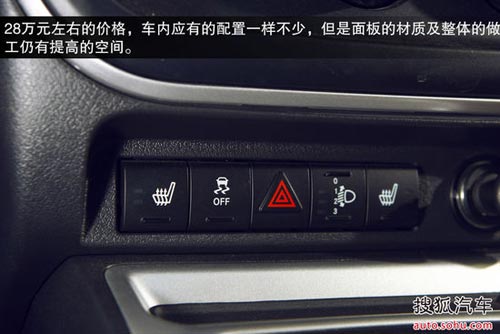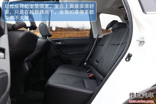乘坐空間方面基本夠用,坐入車內,較高的中控臺加之小尺寸的風擋并沒有給人帶來SUV車型普遍的寬敞視野,不過卻有著很強的包裹感,整體給人感覺是輛不折不扣的硬派車型,很安全。實際的乘坐空間基本夠用,但由于后排中部的高地臺和杯架,使得其后排中部乘客的舒適性大打折扣。