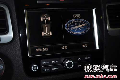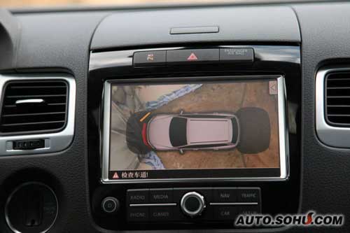 野外的路面觀察是重要的,途銳多角度監控攝像頭很有幫助,這和英菲尼迪的全景式監控影像系統類似,但途銳的可視面積更大。通過位于車身周圍的四個攝像頭將周圍景物反映到中間的液晶屏上,在泊車時可以更直觀的看到四周情況。同時前部和尾部的攝像頭可以提供更廣的可視角度。這樣的功能要比奔馳G500或路虎的路面監測能力進一步提升。