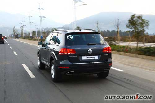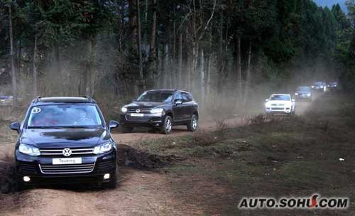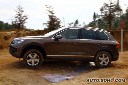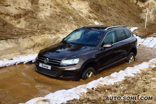 我們還可以為途銳選裝的4Xmotion四驅系統,這個是用戶在購車時能夠自行決定是否加裝的的四驅系統選件,它同時具備了中央電子差速鎖和低速四驅擋之外,還增加了一把后橋電子差速鎖,這樣在越野性能上就有了本質的提升。從實際的表現來看,鎖定中央及后橋差速鎖后,在通過炮彈坑時(交叉軸),懸空的車輪并沒有出現空轉,而是與另外一側車輪保持同樣的轉速通過,可見后橋差速鎖還是起到了關鍵的作用。