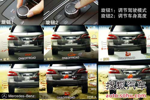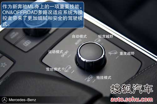 作為新奔馳ML身上的一項重要技能,ON&OFFROAD多路況適應系統為操控者帶來了更加細膩和安全的駕駛模式。從設計方面來看,新奔馳ML不同操控模式的選擇方式與路虎覽勝有些相似,這套系統能夠提供包裹自動模式、運動模式、雪地模式、拖掛模式以及兩種程度越野模式在內的六種選擇。當選擇任何一種模式,系統都會對發動機、變速箱、AIRMATIC空氣懸掛、轉向系統以及牽引力控制系統進行相應調節,另外中控屏幕和儀表盤行車電腦也會隨時向操控者顯示當前狀態。