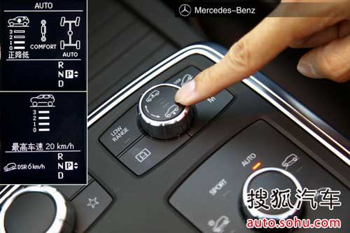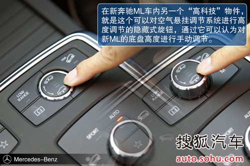 在新奔馳ML車內另一個"高科技"物件,就是這個可以對空氣懸掛調節系統進行高度調節的隱藏式旋鈕,通過它可以人為對新ML的底盤高度進行手動調節。另外,在這個旋鈕的周圍還提供有低速四驅、陡坡緩降以及手動換擋模式等按鈕。