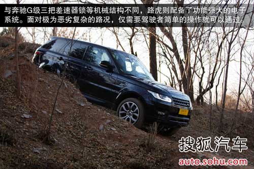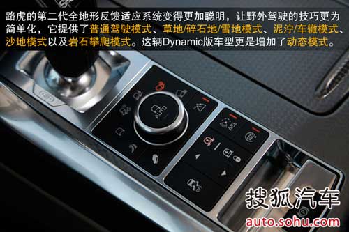 路虎為攬勝運動版提供了兩套四驅系統。一套是帶雙速分動箱的多片式離合器系統,初始狀態下按照50:50的比例平均分配扭矩,但需要時可將全部扭矩輸往前軸或者后軸。另一套四驅系統重量減少18公斤,采用托森式差速器,默認按照42:58的比例分配前后軸的扭矩,但沒有低速擋,調整扭矩分配的范圍也沒有前者那么廣(前軸最多63%,后軸最多77%)。我們所試駕的這輛車匹配了前一套四驅系統,還配備了動態主動式后差速鎖,這個差速鎖配有一個電控差速器,可瞬間改變鎖止程度,對提高車子的運動性和越野能力都有幫助。