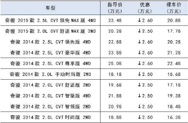 2015年奇駿的銷量一直不錯(cuò),為了保持這一良好的銷售成績,經(jīng)銷商可謂是拼了,優(yōu)惠幅度不斷看漲,年底經(jīng)銷商報(bào)出了2.6萬元的優(yōu)惠力度。