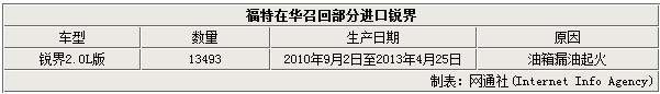 據了解此次福特汽車在華涉及召回的車型為進口銳界2.0L版本,生產于2010年9月2日至2013年4月25日期間,共涉及13,493輛。在中國市場銳界于2011年正式引入由福特中國以進口形式銷售,網通社在采訪銳界車主后發現:銳界車型燃油泄漏的案例在銳界車主當中時有發生,發生這種隱患的頻率遠高于其他品牌車型;甚至國內還發生過剛買不久的銳界車型發生自燃的極端情況。