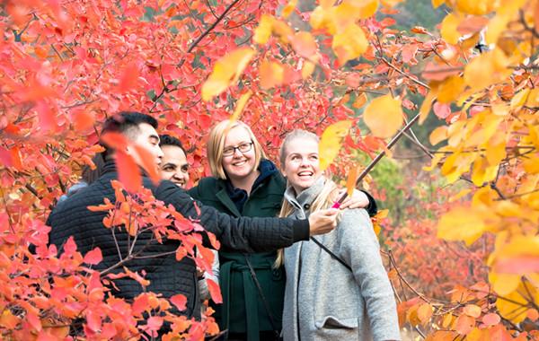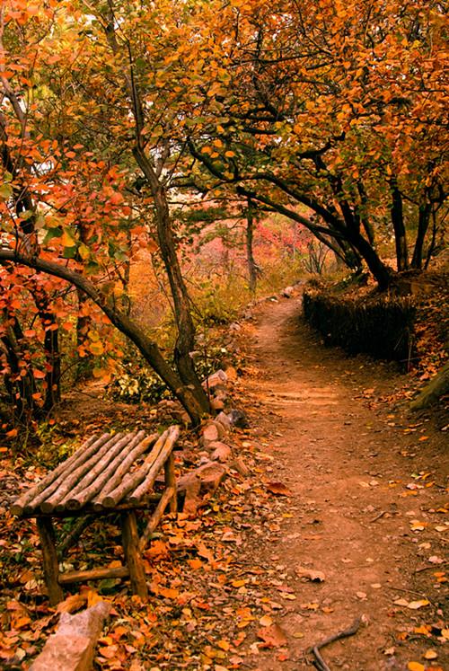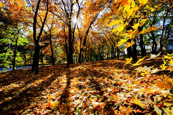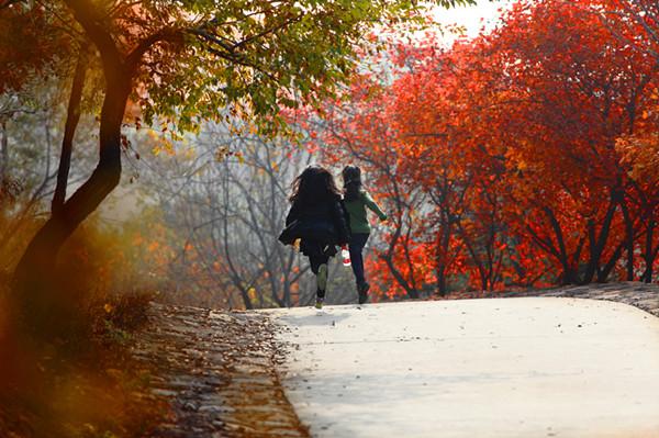公園寬寬窄窄的道路上隨處可觀紅葉的風采。在紅葉路上,與友人、家人一起邊拍邊走,歡聲笑語蕩漾在林中,幸福瞬間在此時定格。登山攀爬的途中,腳踏落紅繽紛,兩側紅葉隨行,完全沉浸在楓葉的天地里了。