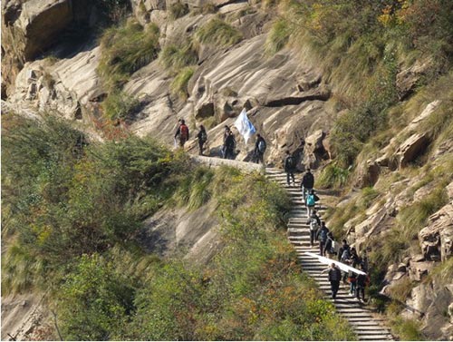 宣傳活動的每周五晚,大巴車載著“勇闖一族”大學生們向清涼峰駐地——永來村進發,到達永來村已是凌晨00:30多,由于清涼峰道路原始而沒有臺階,并且要翻過數個山頭,加之行程較長,要達到1787.4米峰頂并在太陽下山前返回駐地,必須要在凌晨05:00前動身攀爬,那就意味著同學們只有不足4個小時的睡眠。盡管如此安排,90后的“勇闖一族大學生們”沒有一句怨言,并有紀律、有計劃地執行被安排的各項工作(早餐、準備裝備等),在攀爬途中,在崎嶇的山路上手腳并用,表現出了不僅僅是旺盛的生命力,更表現出了不屈不撓的意志力,在大家的共同努力下,兩所大學所有隊員均成功登頂,完美詮釋了“勇闖一族”的勇闖天涯精神。
