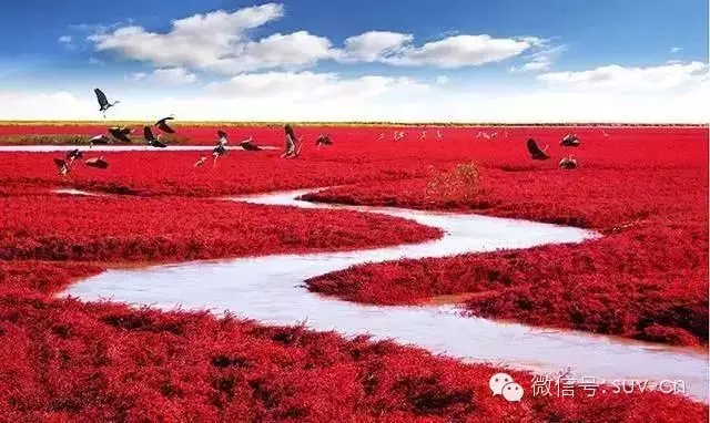 紅海灘并非真正的海灘而是由大片大片的堿蓬草形成的海洋般的濕地。簇簇紅色向遙遠的天際無限地延伸時,那種壯美奇麗一定會令你無法立辨真幻,如果不是親見,沒有人能想象,它是如何鋪天蓋地的廣闊,攝魂奪魄的壯美。