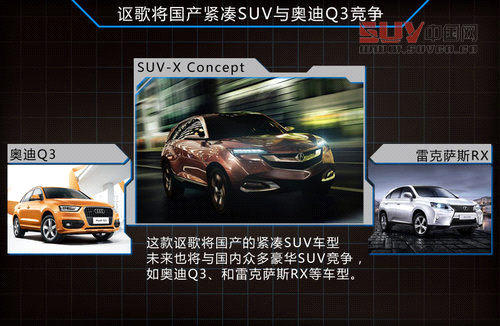 Acura(謳歌)在未來國產后的產品規劃方面,計劃投產的首款車型是上海車展期間首發的緊湊型SUV Concept SUV-X,并計劃在三年左右的時間實現國產。本田中國總經理倉石誠司表示,“由于緊湊型SUV是未來增長最快也是最大的一個細分市場,環境問題和中國的能耗限制越來越嚴格,同樣是我們選擇率先國產緊湊SUV的原因。”而這款車型未來也將與國內市場上眾多豪華SUV競爭,如奧迪Q3、寶馬X1以及雷克薩斯RX等。此外,這款SUV也是Acura(謳歌)首次在北美市場以外進行全球首發的車型,從而也展示出中國市場的重要性。